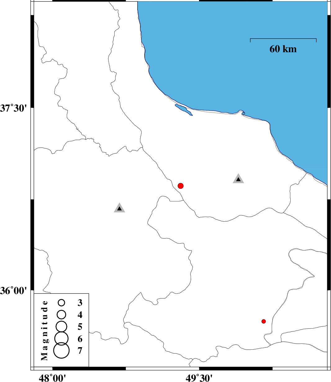 | 2014/05/10 | 03:22:47.7 | 07:52:47.7 | 36.86 | 49.31 | 32 | ML2.5 | Gilan Province, 11 km West of Rudbar | ||