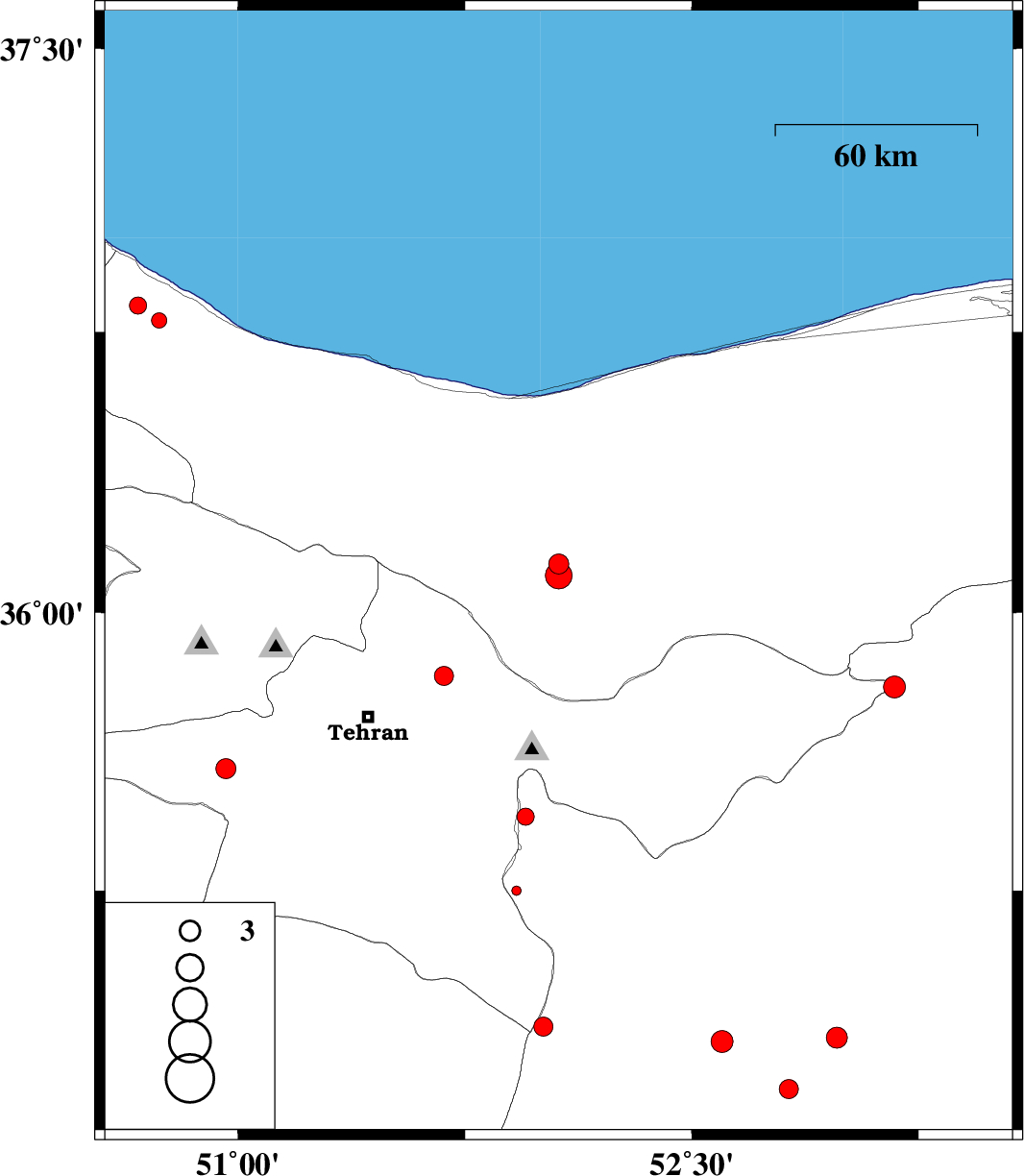 | 2014/04/13 | 06:08:46.5 | 10:38:46.5 | 35.83 | 51.68 | 15 | ML2.8 | Tehran Province, 22 km East of Tajrish |