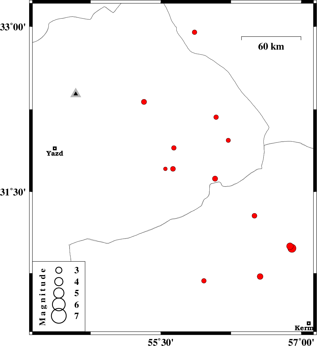 | 2014/04/11 | 23:36:13.3 | 04:06:13.3 | 30.98 | 56.9 | 14 | ML4 | Kerman Province, 33 km South of Ravar |