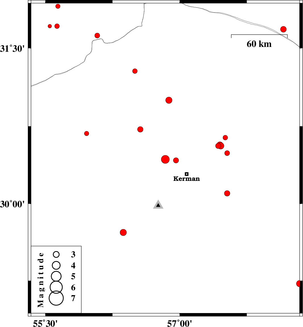 2014/05/10 13:36:37.4 18:06:37.4 29.7256.3714 ML3.2 Kerman Province, 30 km South-West of Bardsir