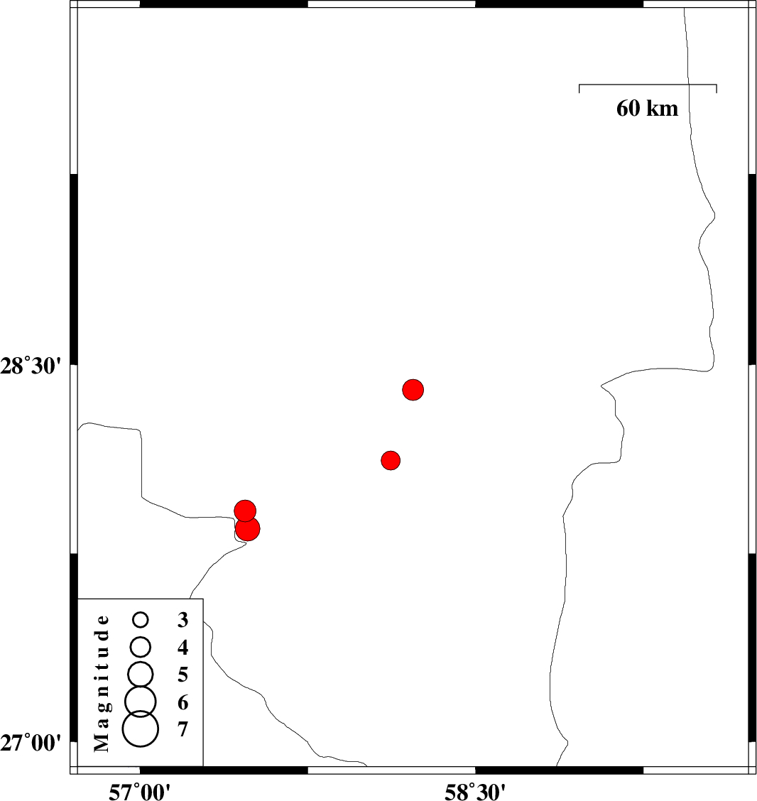| 2014/05/09 | 00:08:43.7 | 04:38:43.7 | 27.85 | 57.48 | 14 | ML4.9 | Kerman Province, 24 km South-West of Kahnuj | ||