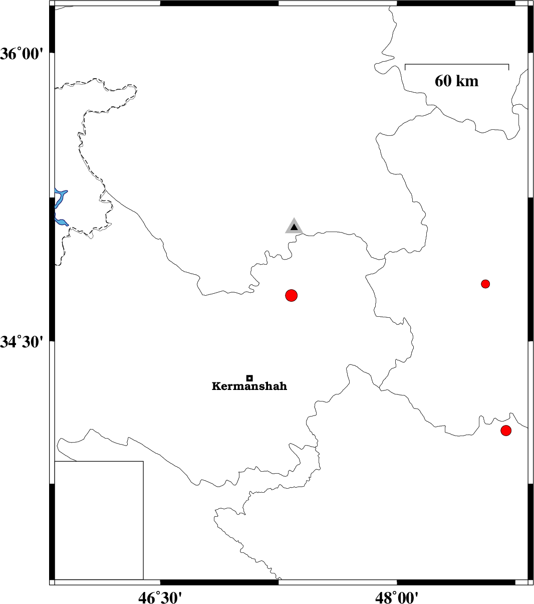 | 2014/05/12 | 20:45:21.1 | 01:15:21.1 | 34.74 | 47.33 | 18 | ML3.4 | Kermanshah Province, 25 km West of Sonqor | ||
