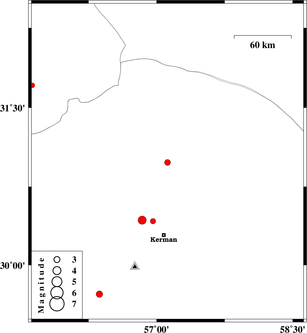 | 2014/05/10 | 13:36:37.4 | 18:06:37.4 | 29.72 | 56.37 | 14 | ML3.2 | Kerman Province, 30 km South-West of Bardsir |