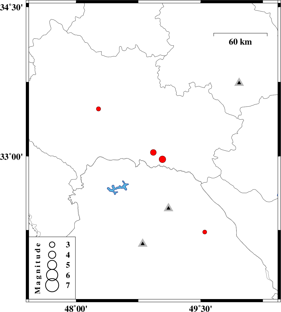 | 2014/05/15 | 07:49:17.8 | 12:19:17.8 | 33.04 | 48.93 | 6 | ML3.2 | Lorestan Province, 51 km South-West of Dorud | ||