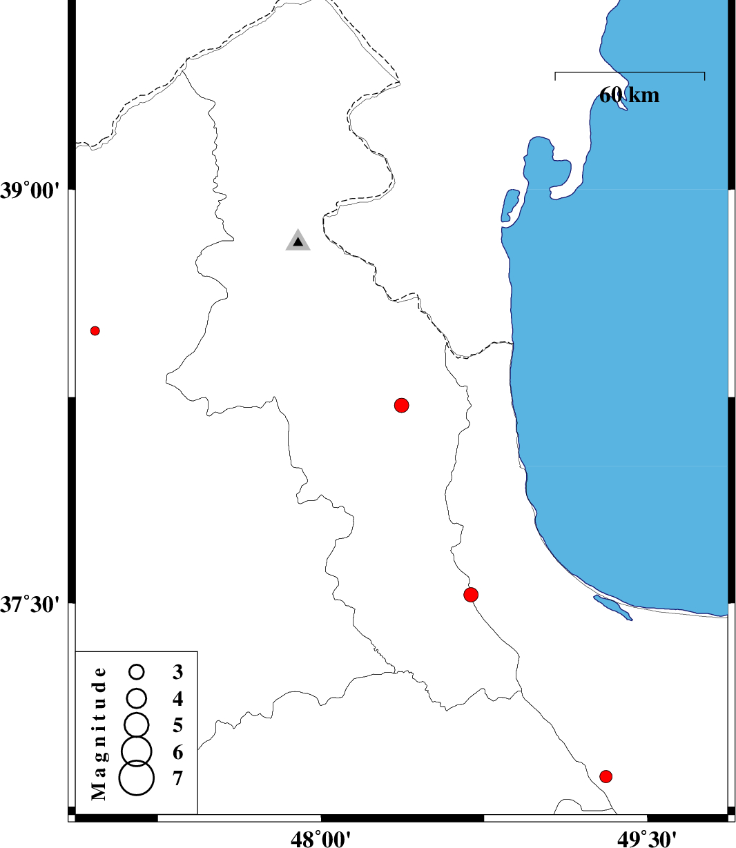 | 2014/04/29 | 01:44:53.4 | 06:14:53.4 | 38.49 | 46.96 | 6 | ML1.8 | Azarbaijan Sharghi Province, 10 km West of Ahar |