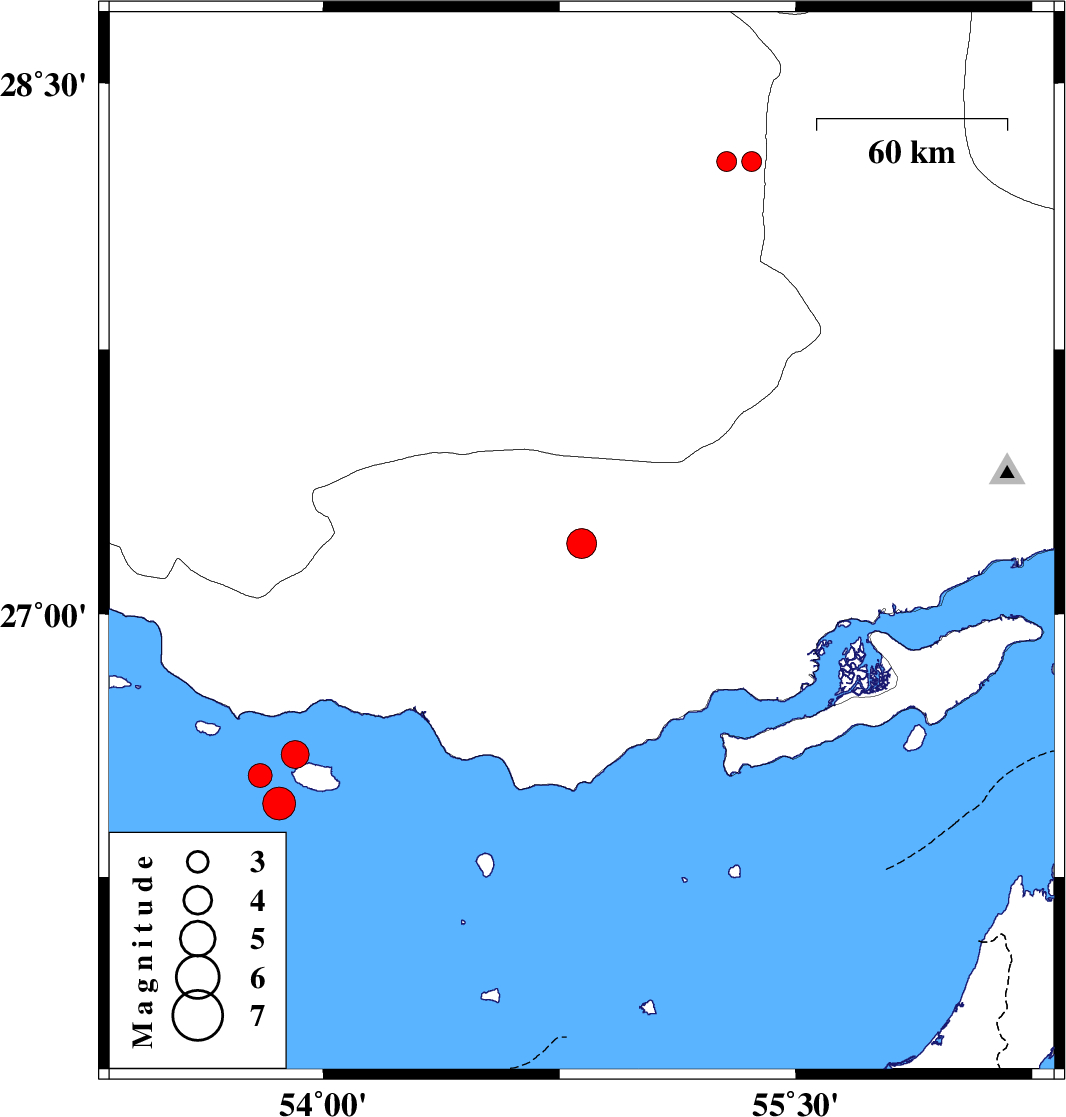 | 2014/05/07 | 15:04:21.0 | 19:34:21.0 | 26.54 | 53.8 | 14 | ML3.4 | Persian Gulf | ||