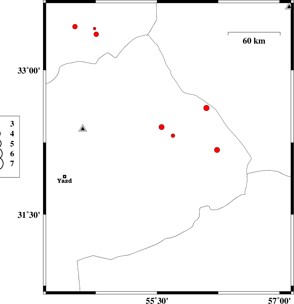 | 2014/05/12 | 04:00:16.4 | 08:30:16.4 | 32.27 | 55.38 | 14 | ML2.7 | Yazd Province, 75 km North of Bafq |