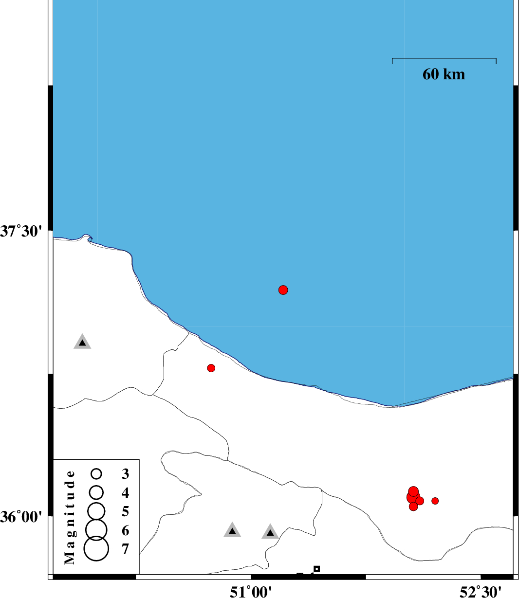 2014/05/19 | 03:01:48.4 | 07:31:48.4 | 37.19 | 51.21 | 45 | ML2.7 | Caspian Sea, 51 km North-East of Tonekabon | ||