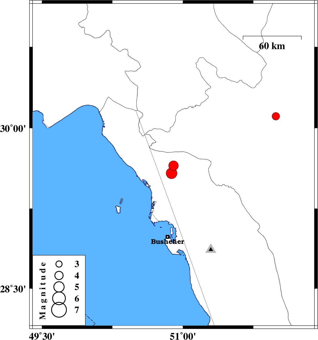 2014/05/21 | 13:25:22.1 | 17:55:22.1 | 29.65 | 50.9 | 18 | ML4.6 | Bushehr Province, 38 km East of Bandar-e genaveh | ||