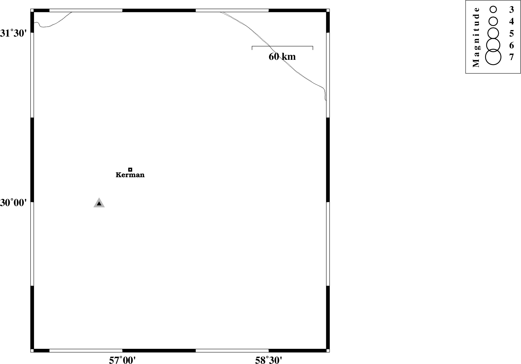 | 2014/04/23 | 11:15:41.9 | 15:45:41.9 | 30.57 | 57.45 | 14 | ML2.8 | Kerman Province, 47 km North-East of Kerman |
