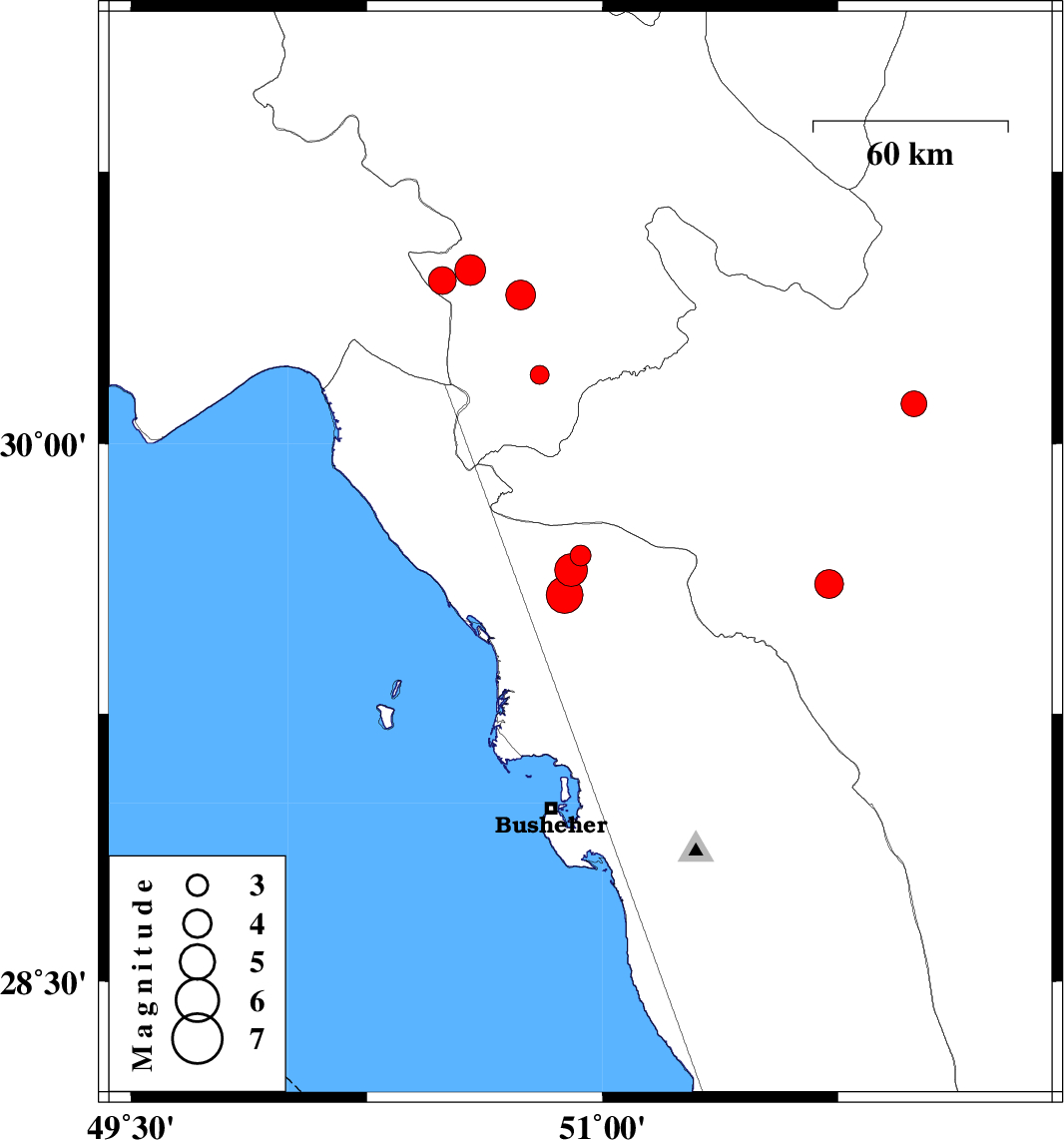 2014/05/22 | 18:01:27.7 | 22:31:27.7 | 29.69 | 50.93 | 18 | ML2.9 | Bushehr Province, 42 km North-East of Bandar-e genaveh | ||