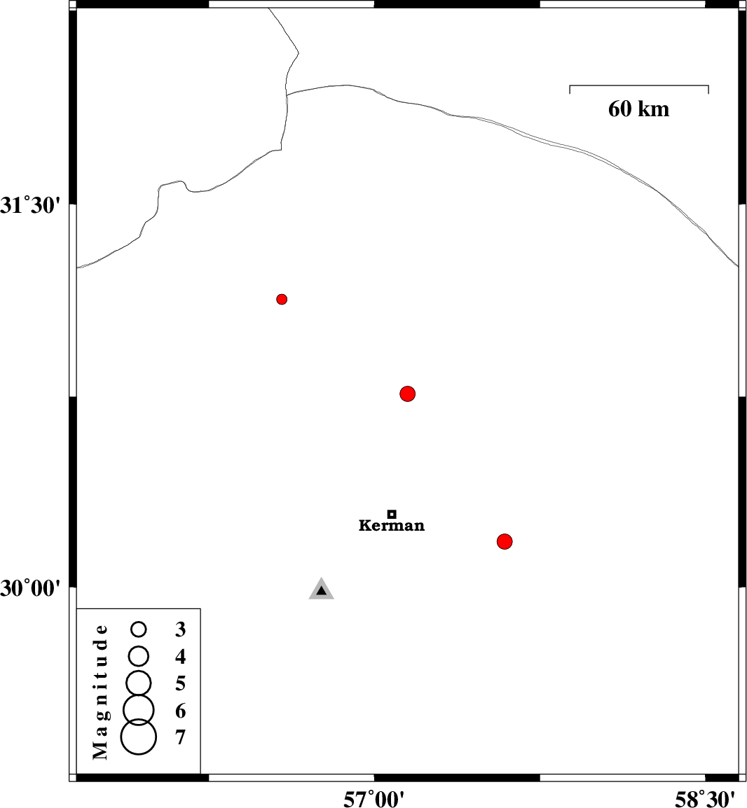 | 2014/05/22 | 10:20:13.4 | 14:50:13.4 | 30.76 | 57.15 | 14 | ML3.1 | Kerman Province, 52 km North of Kerman | ||