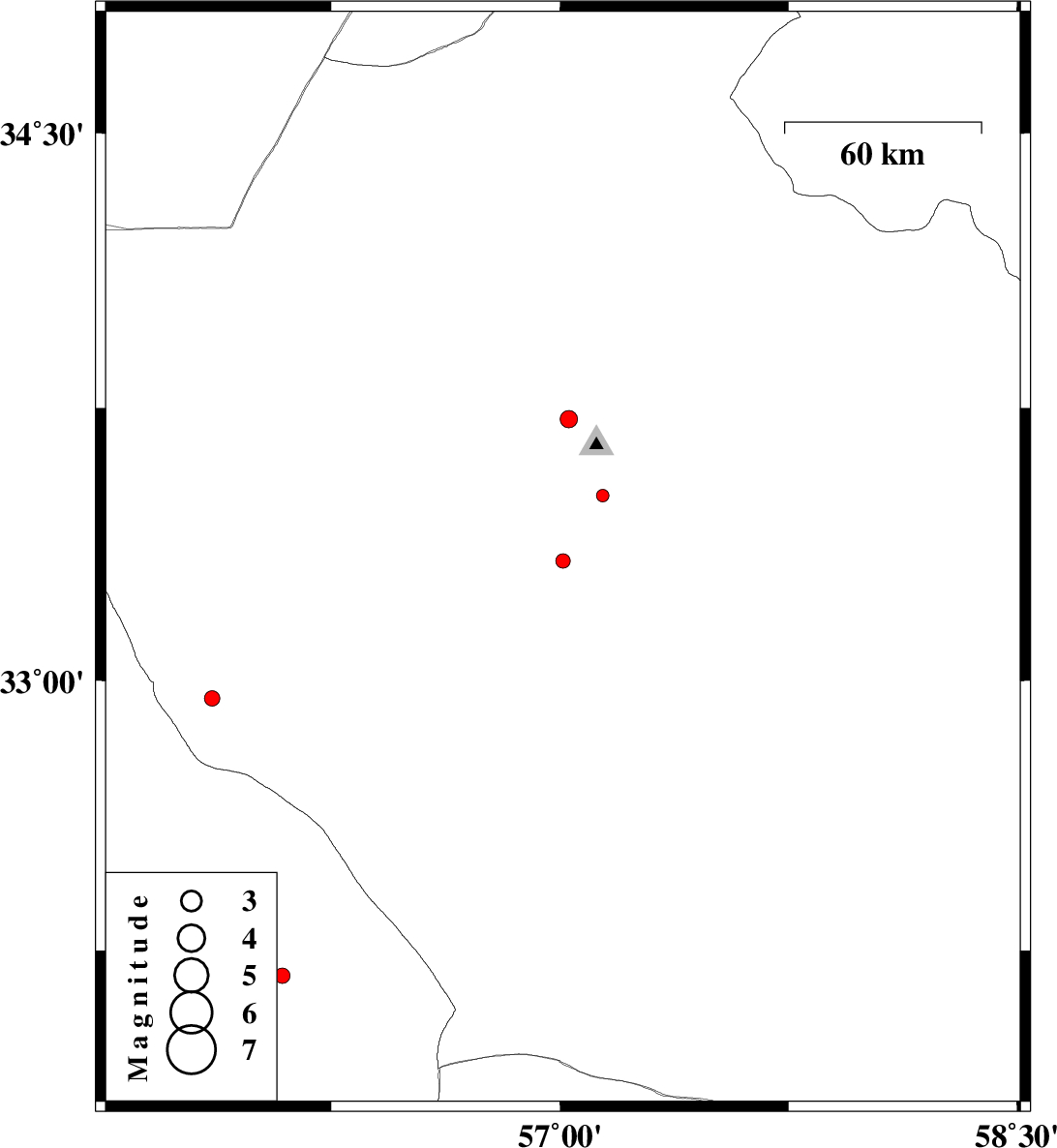 | 2014/05/06 | 00:53:55.9 | 05:23:55.9 | 33.51 | 57.14 | 14 | ML1.9 | Yazd Province, 22 km East of Tabas | ||