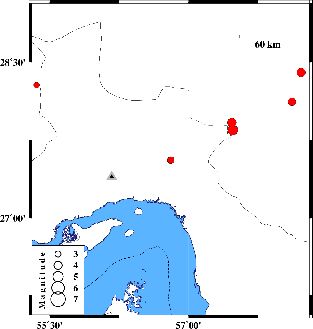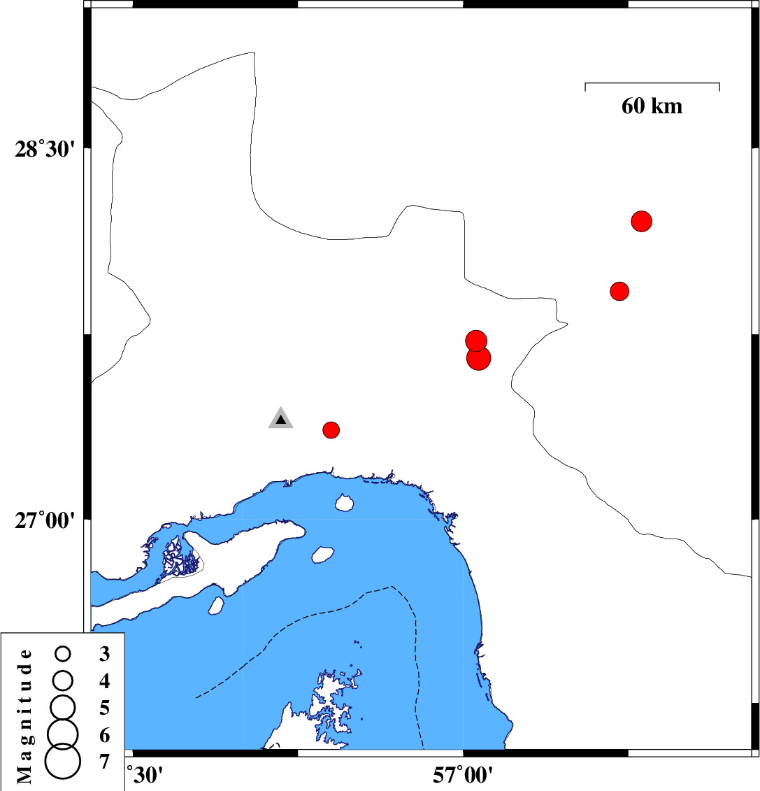 | 2014/05/27 | 17:38:04.6 | 22:08:04.6 | 27.56 | 56.81 | 17 | ML3.4 | Hormozgan Province, 45 km North-West of Dehbarez | ||