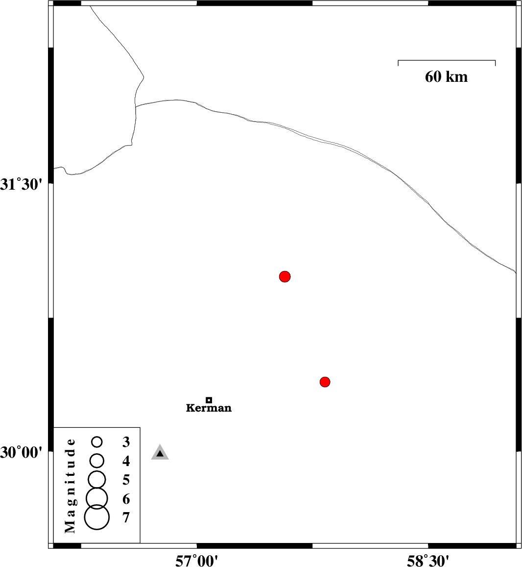 | 2014/05/30 | 16:49:56.3 | 21:19:56.3 | 30.98 | 57.57 | 18 | ML3.2 | Kerman Province, 78 km South-East of Ravar | ||