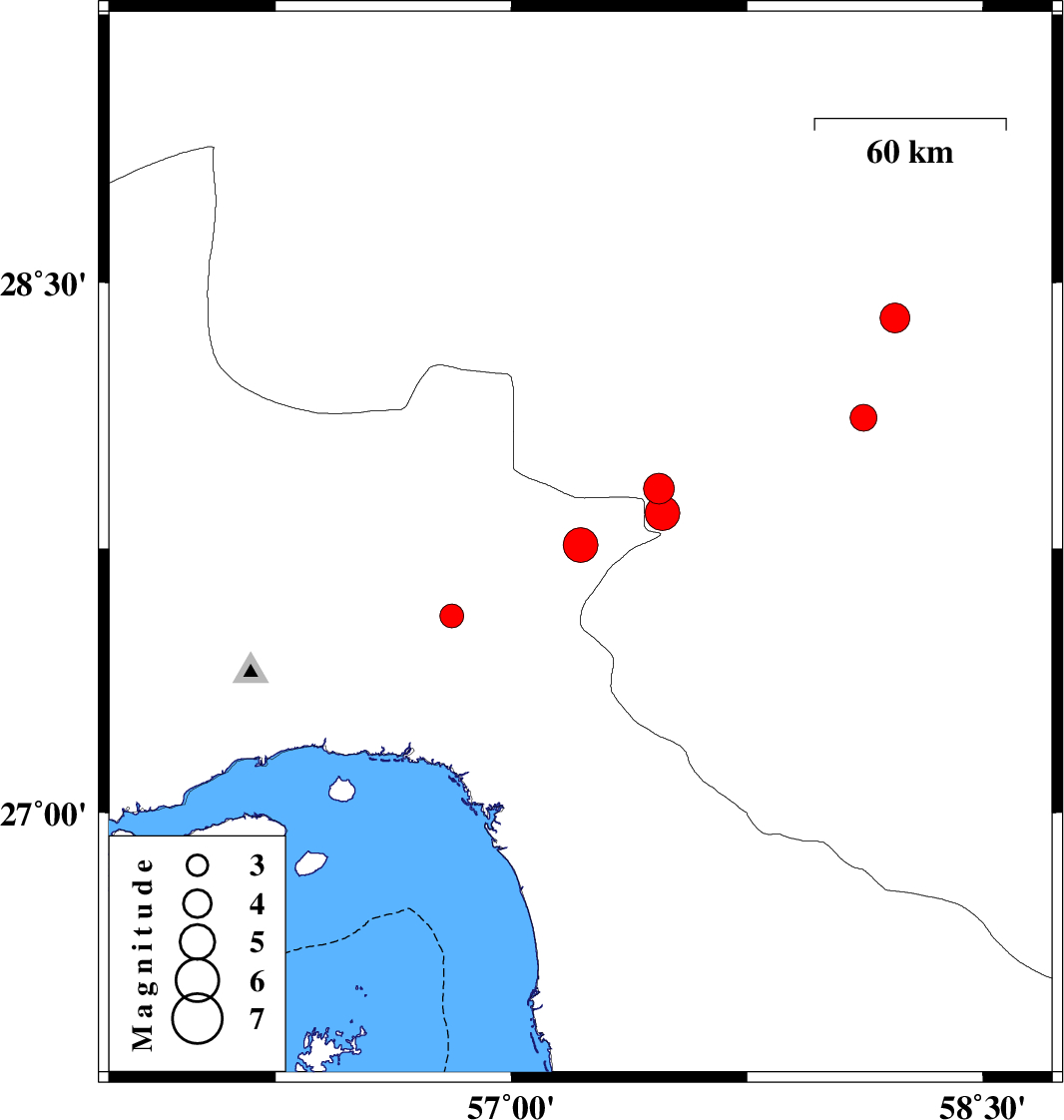 | 2014/05/27 | 05:44:29.2 | 10:14:29.2 | 26.46 | 55.78 | 15 | Mb4.9 | Persian Gulf, 73 km South-West of Qeshm | ||