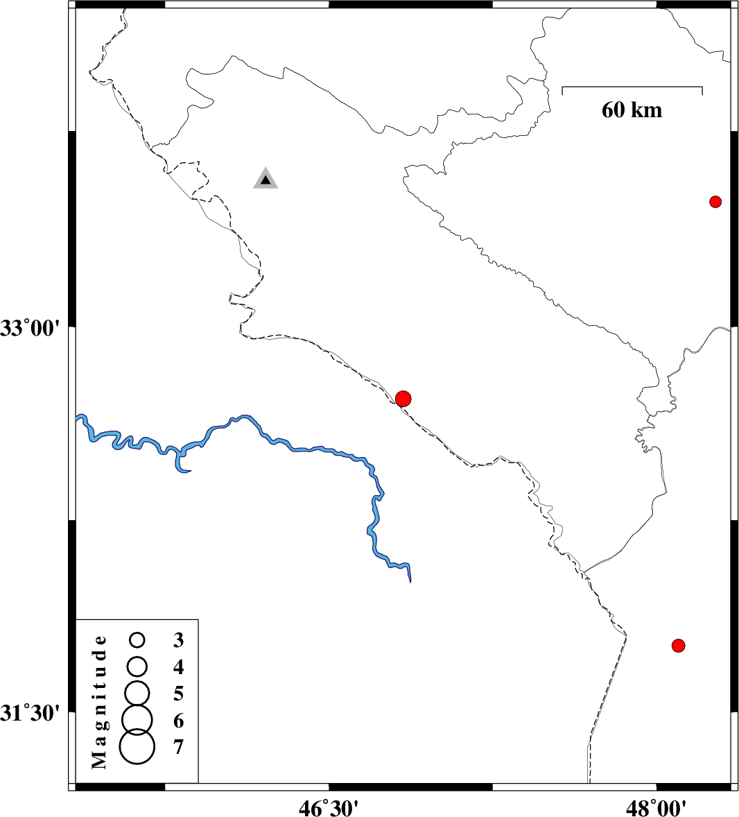 | 2014/06/03 | 05:30:32.8 | 10:00:32.8 | 32.72 | 46.84 | 14 | ML3.2 | Ilam Province, 39 km West of Dehloran | ||