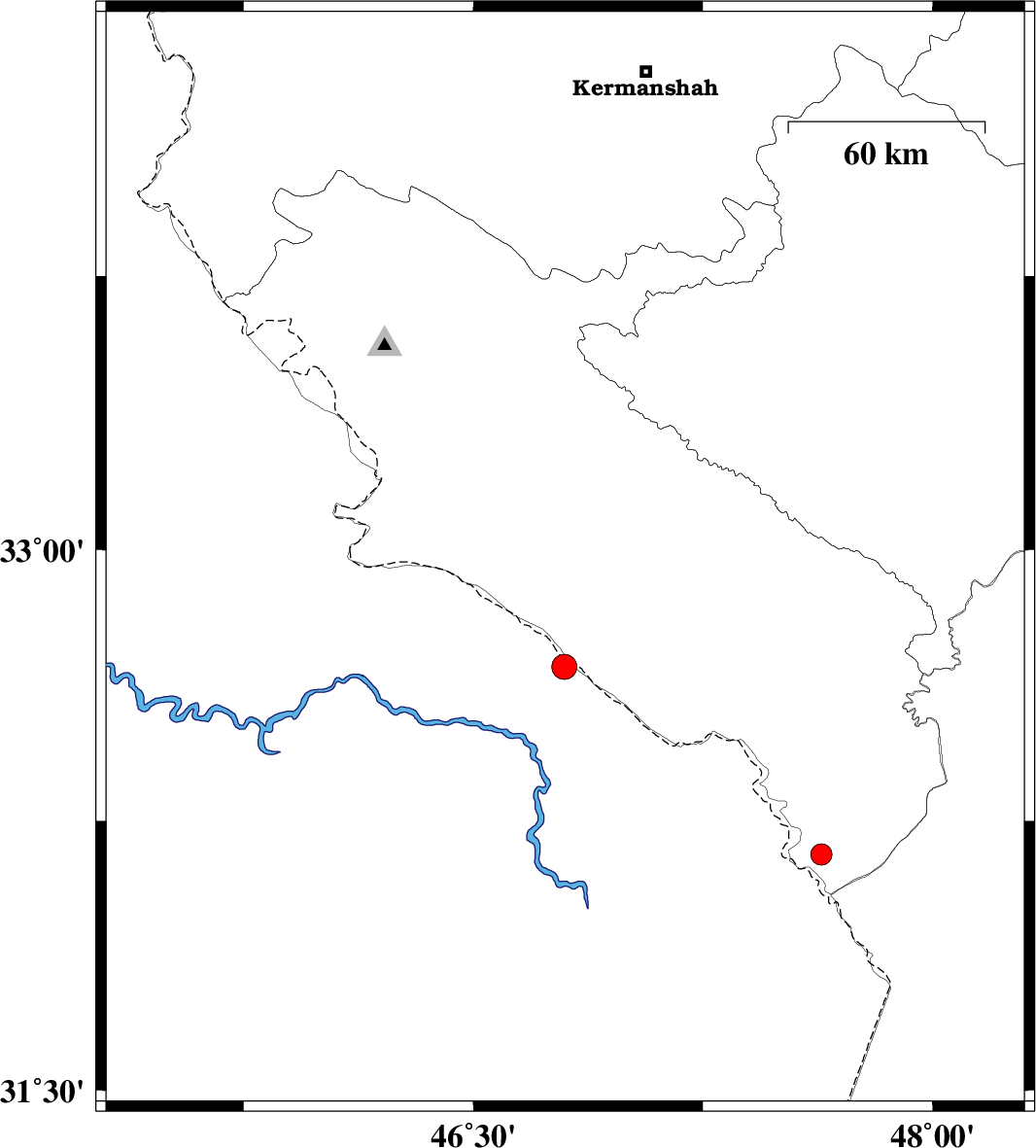 | 2014/06/03 | 05:30:32.8 | 10:00:32.8 | 32.72 | 46.84 | 14 | ML3.2 | Ilam Province, 39 km West of Dehloran | ||