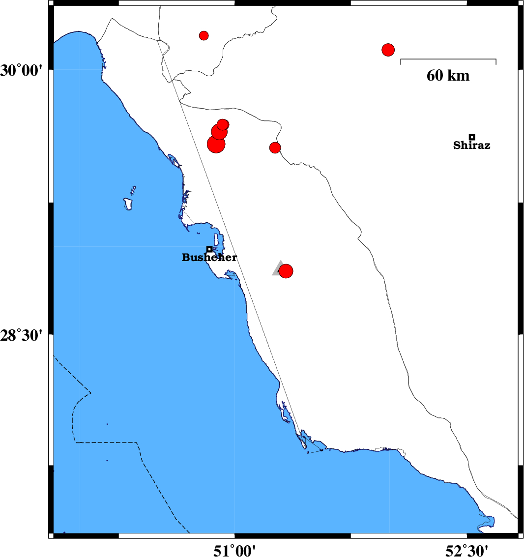 | 2014/05/21 | 09:46:29.1 | 14:16:29.1 | 29.58 | 50.88 | 18 | ML5.2 | Bushehr Province, 35 km East of Bandar-e genaveh | ||