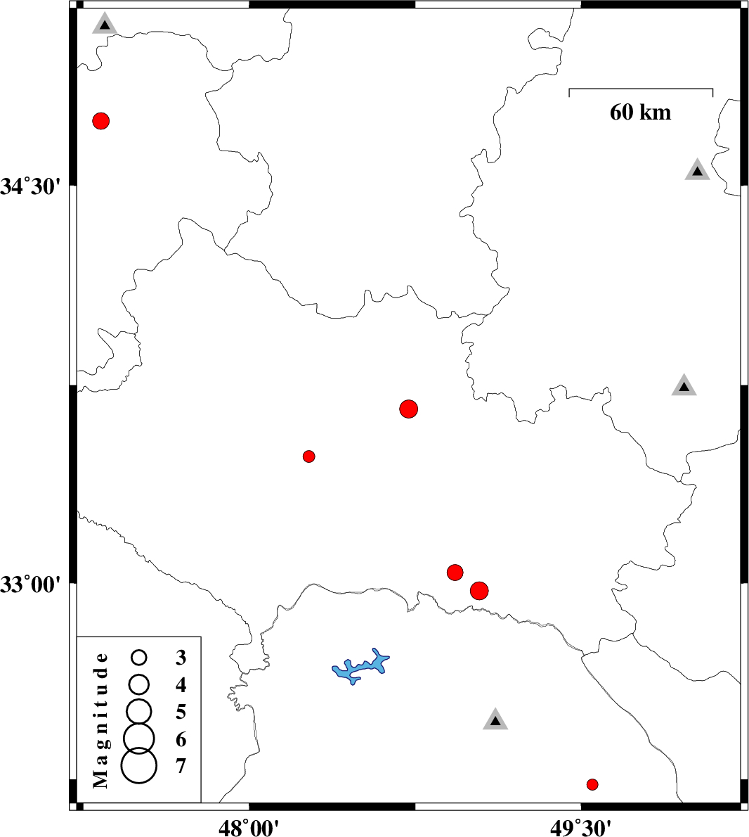 | 2014/05/15 | 07:49:17.8 | 12:19:17.8 | 33.04 | 48.93 | 6 | ML3.2 | Lorestan Province, 51 km South-West of Dorud | ||