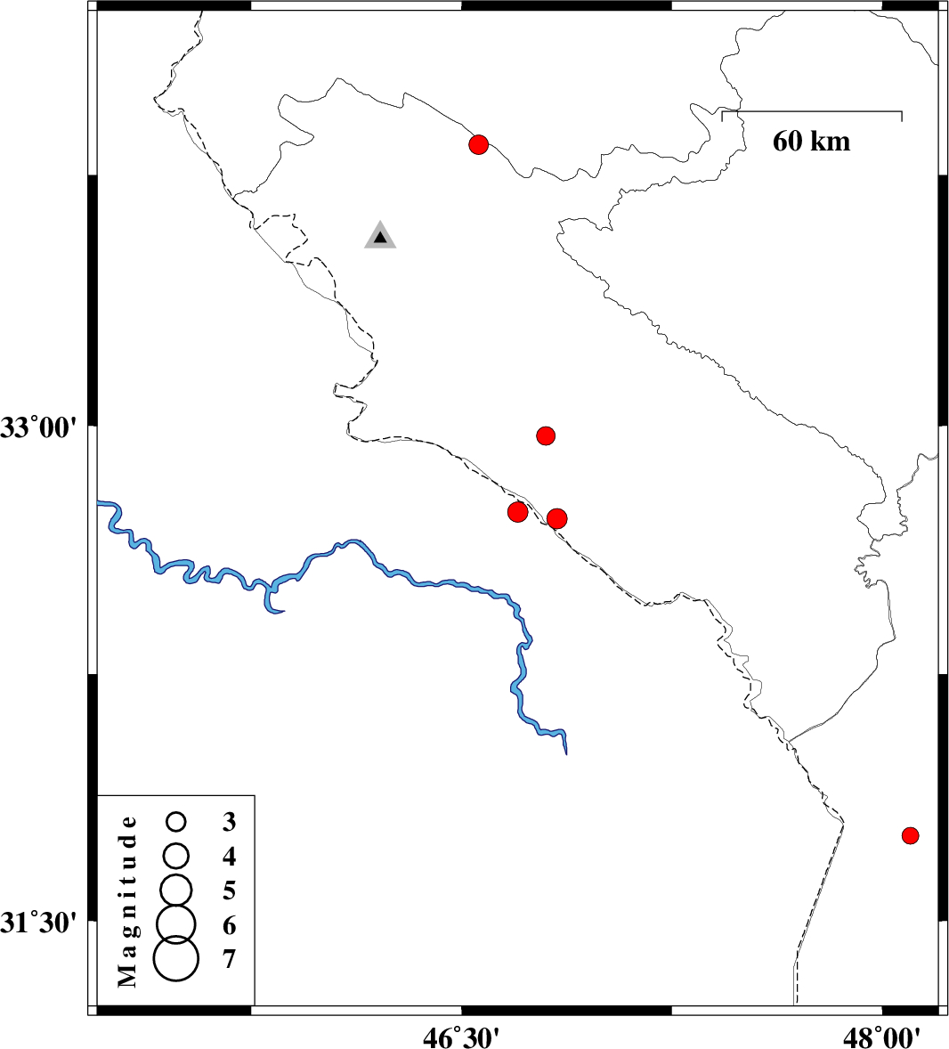 | 2014/06/03 | 05:30:32.8 | 10:00:32.8 | 32.72 | 46.84 | 14 | ML3.2 | Ilam Province, 39 km West of Dehloran | ||