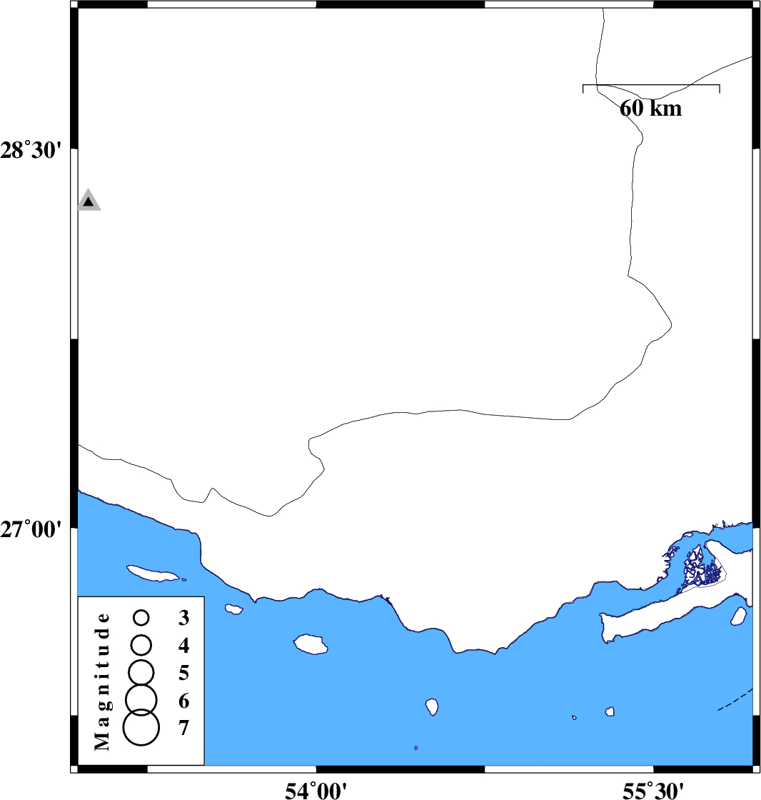 | 2014/06/08 | 06:09:55.8 | 10:39:55.8 | 27.55 | 54.44 | 14 | ML3.7 | Fars Province, 18 km South-East of Lar |