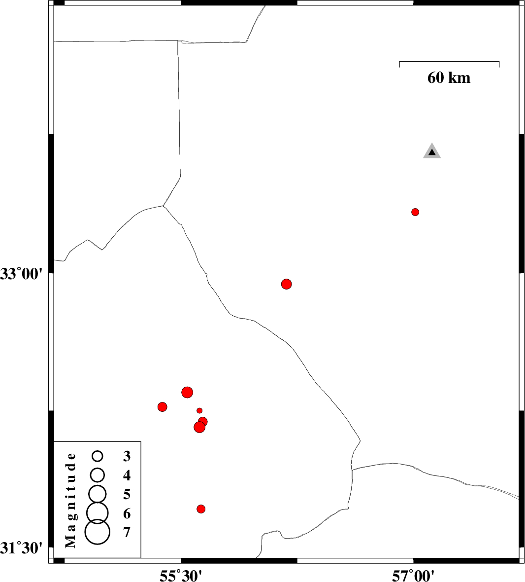 | 2014/05/21 | 06:59:51.4 | 11:29:51.4 | 32.35 | 55.54 | 17 | ML3.2 | Yazd Province, 84 km North-East of Bafq | ||