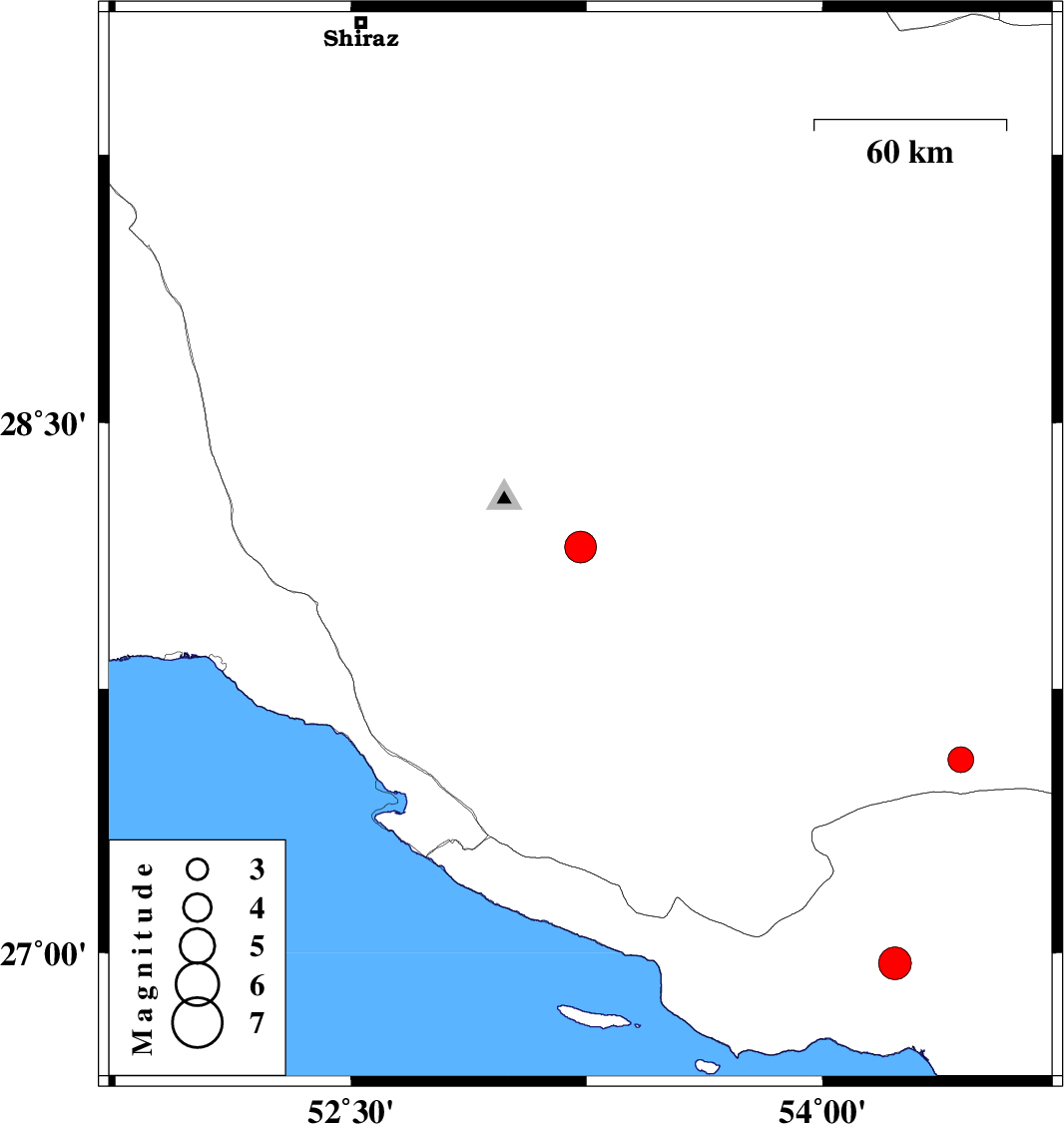 | 2014/06/12 | 02:37:18.9 | 07:07:18.9 | 28.15 | 53.23 | 17 | ML4.5 | Fars Province, 40 km South-East of Qir va Karzin | ||