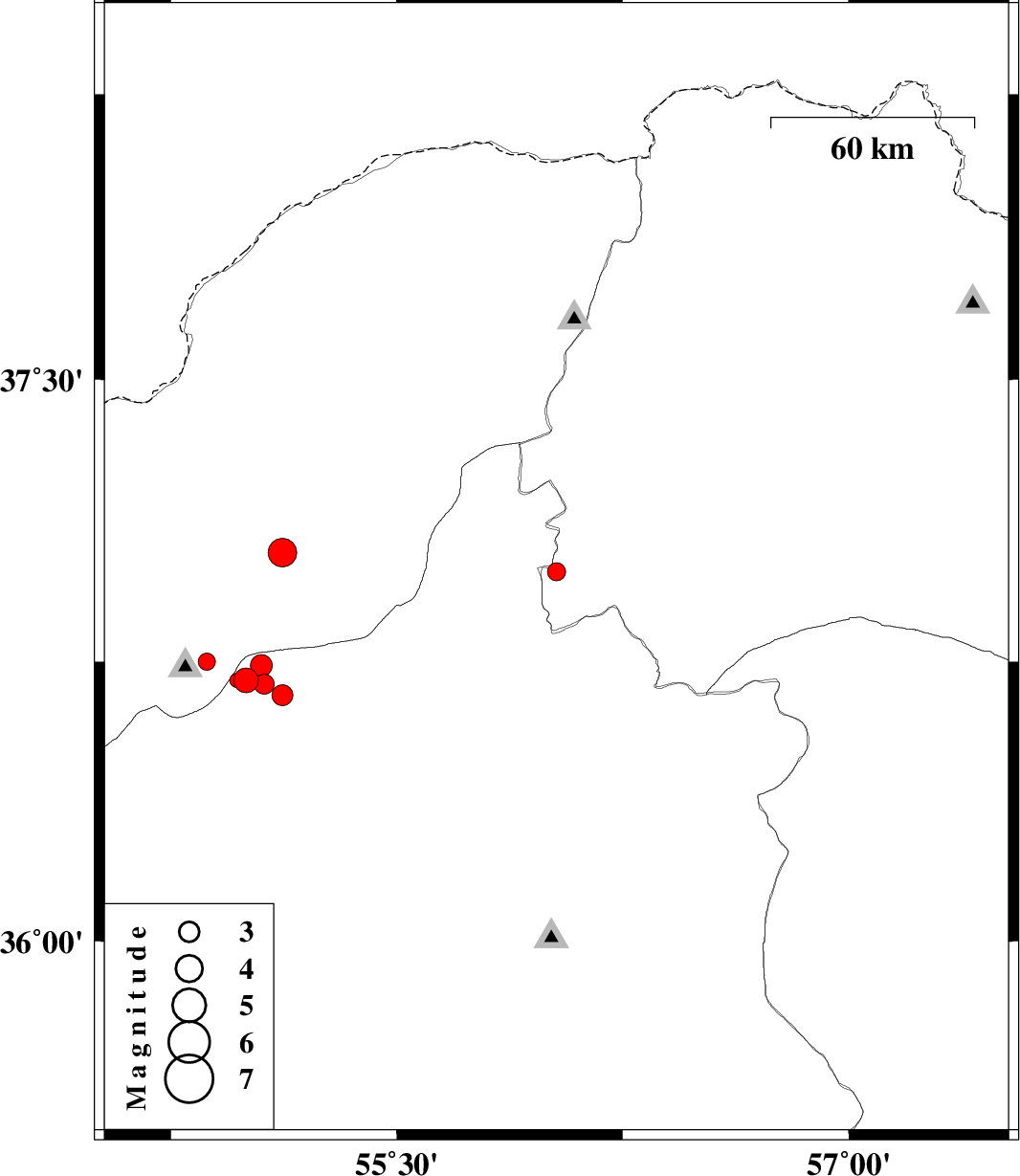 | 2014/06/06 | 12:54:29.6 | 17:24:29.6 | 36.7 | 55 | 17 | ML3.6 | Semnan Province, 31 km North of Shahrud | ||