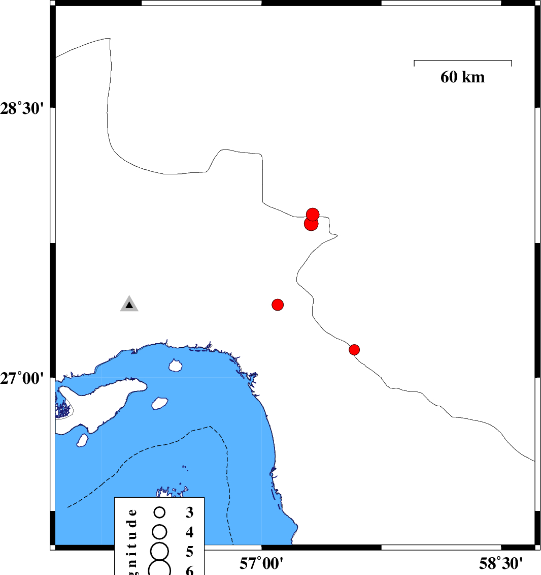 | 2014/06/11 | 06:06:33.0 | 10:36:33.0 | 28.26 | 56.94 | 14 | ML3.9 | Kerman Province, 81 km North-West of Kahnuj |