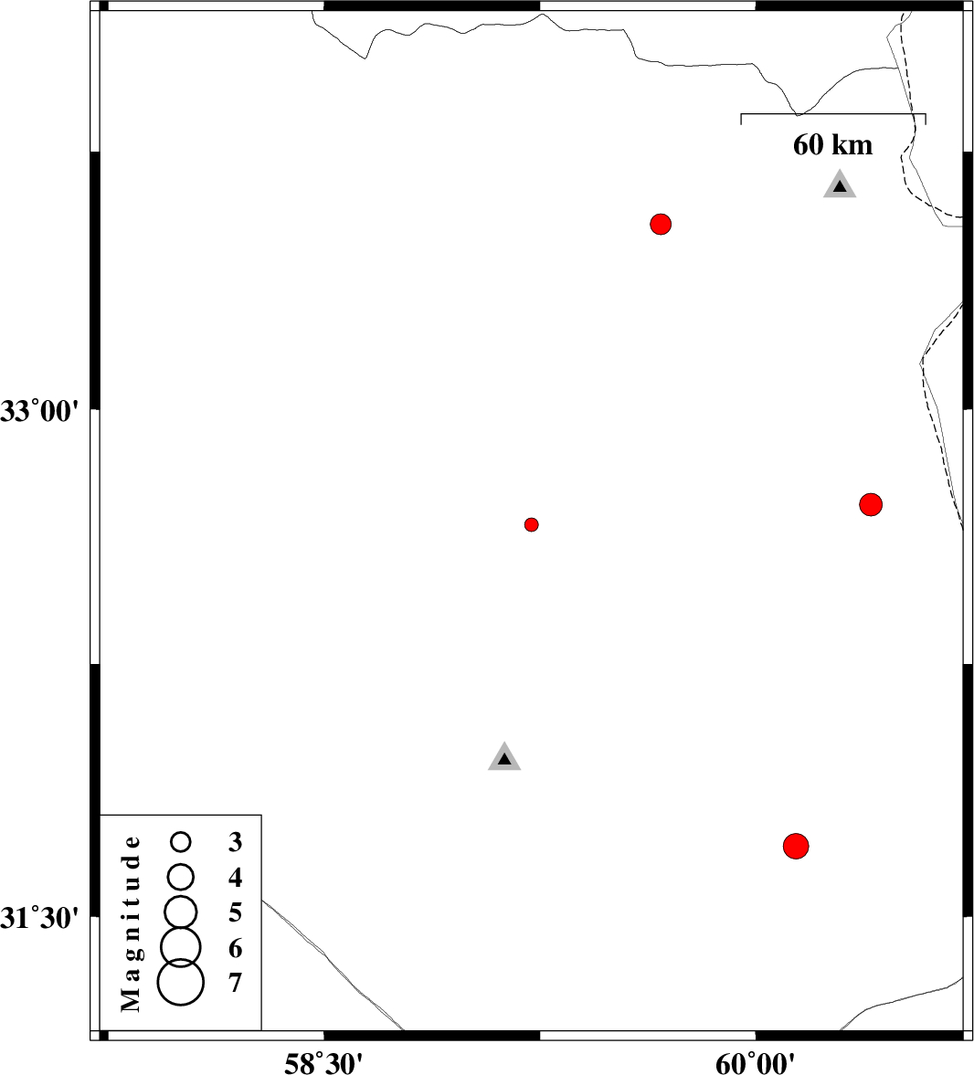 | 2014/06/20 | 03:32:57.5 | 08:02:57.5 | 32.66 | 59.22 | 14 | ML2.1 | Khorasan(south) Province, 27 km South of Birjand | ||