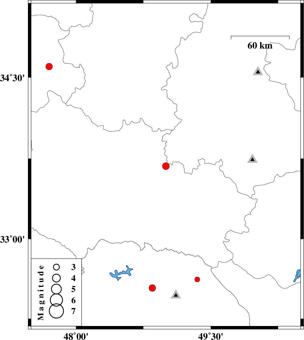 | 2014/06/21 | 03:11:07.2 | 07:41:07.2 | 33.68 | 49 | 14 | ML3.5 | Lorestan Province, 23 km North of Dorud | ||