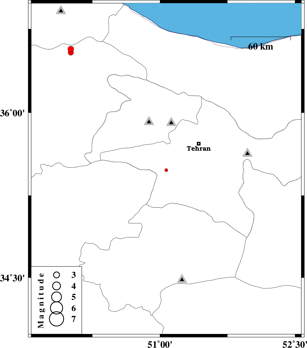 | 2014/06/22 | 15:56:41.5 | 20:26:41.5 | 35.48 | 51.07 | 17 | ML1.6 | Tehran Province, 2 km Robatkarim | ||