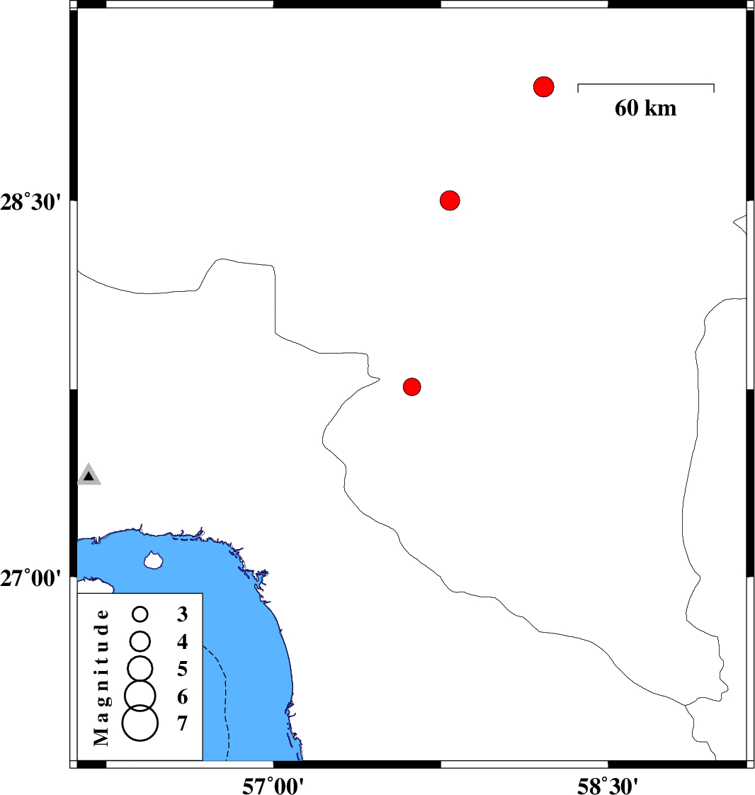 | 2014/06/25 | 14:20:11.1 | 18:50:11.1 | 27.76 | 57.62 | 14 | ML3.5 | Kerman Province, 22 km South of Kahnuj | ||