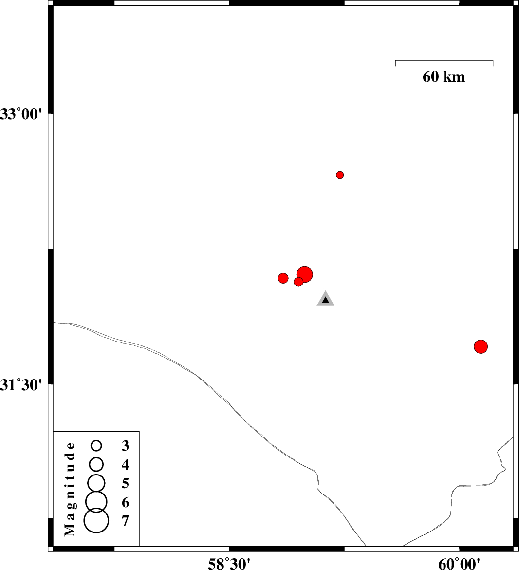 | 2014/06/28 | 19:31:37.6 | 00:01:37.6 | 32.07 | 58.95 | 14 | ML2.7 | Khorasan(south) Province, 96 km South-West of Birjand | ||