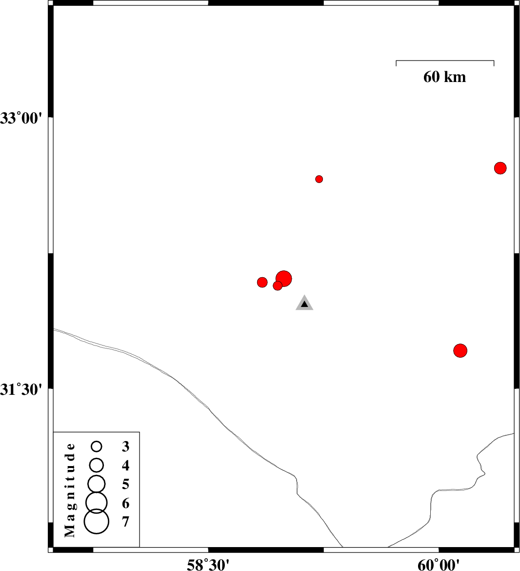 | 2014/06/28 | 19:31:37.6 | 00:01:37.6 | 32.07 | 58.95 | 14 | ML2.7 | Khorasan(south) Province, 96 km South-West of Birjand | ||