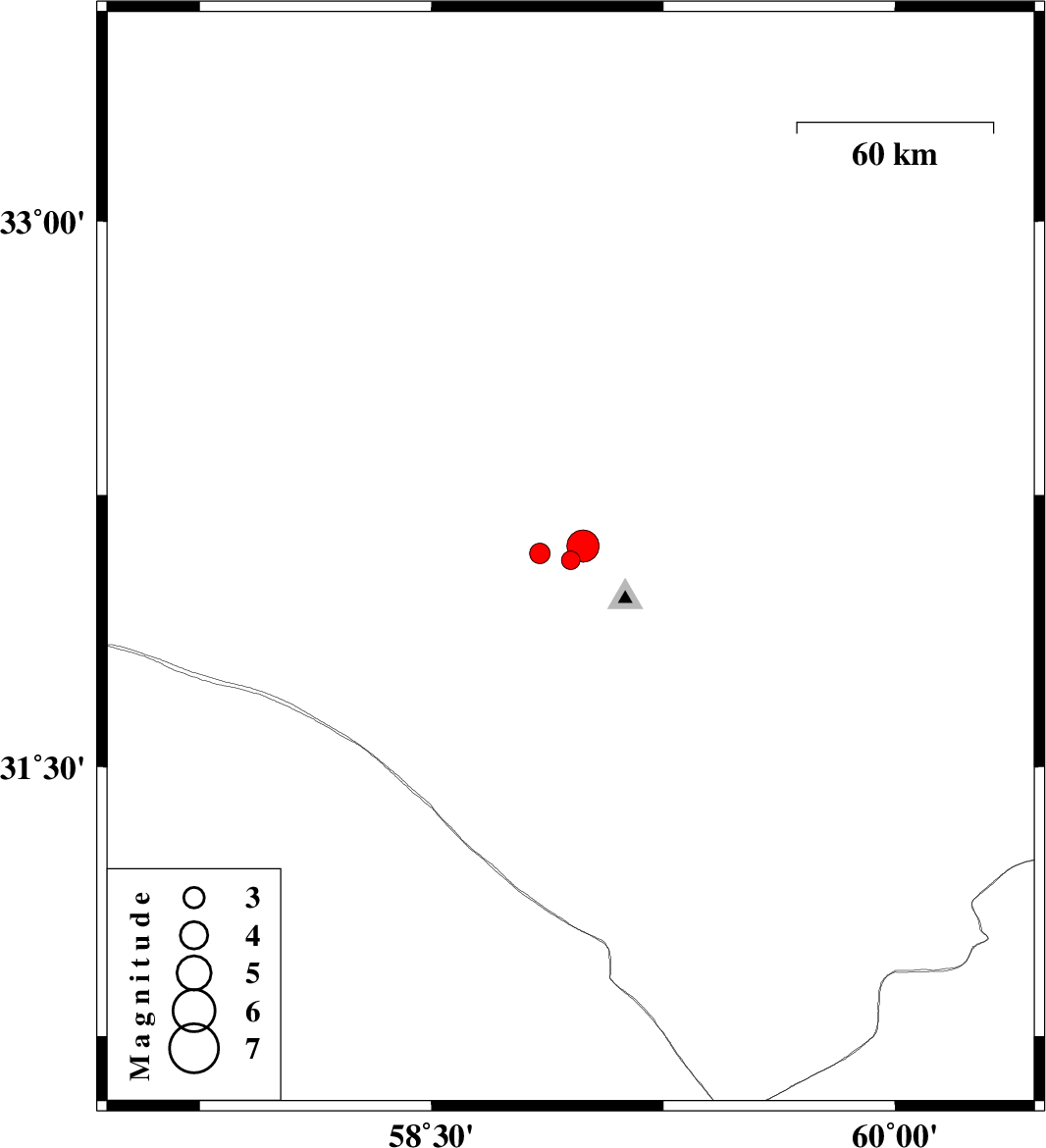| 2014/06/28 | 19:31:37.6 | 00:01:37.6 | 32.07 | 58.95 | 14 | ML2.7 | Khorasan(south) Province, 96 km South-West of Birjand | ||