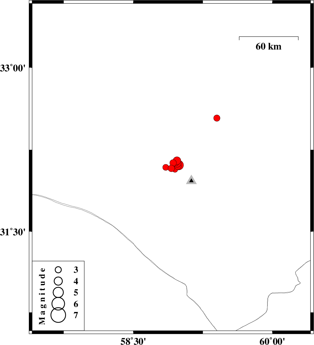 | 2014/06/28 | 19:31:37.6 | 00:01:37.6 | 32.07 | 58.95 | 14 | ML2.7 | Khorasan(south) Province, 96 km South-West of Birjand | ||