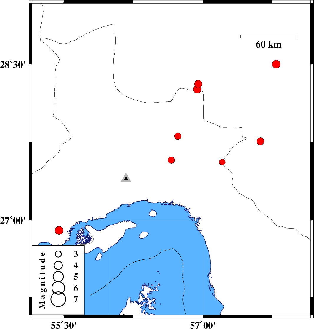| 2014/07/07 | 02:11:14.9 | 06:41:14.9 | 27.58 | 56.66 | 6 | ML3.2 | Hormozgan Province, 60 km North-West of Dehbarez | ||
