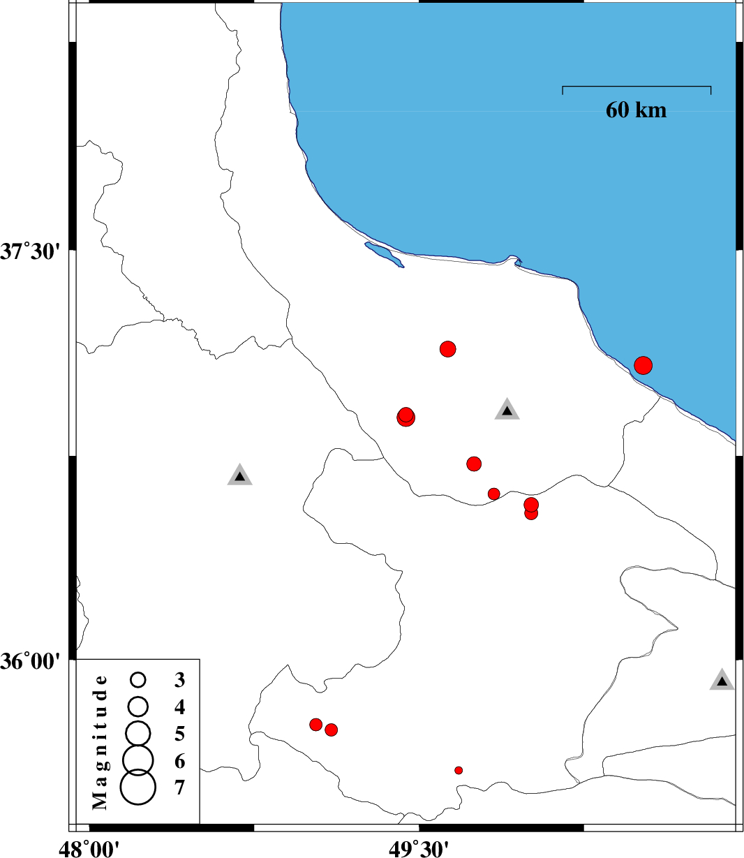 | 2014/07/01 | 15:42:46.3 | 20:12:46.3 | 37.14 | 49.63 | 14 | ML3.3 | Gilan Province, 16 km South of Rasht | ||