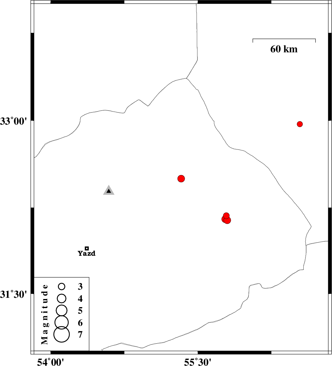 | 2014/07/06 | 03:29:31.7 | 07:59:31.7 | 32.18 | 55.79 | 18 | ML2.8 | Yazd Province, 74 km North-East of Bafq | ||