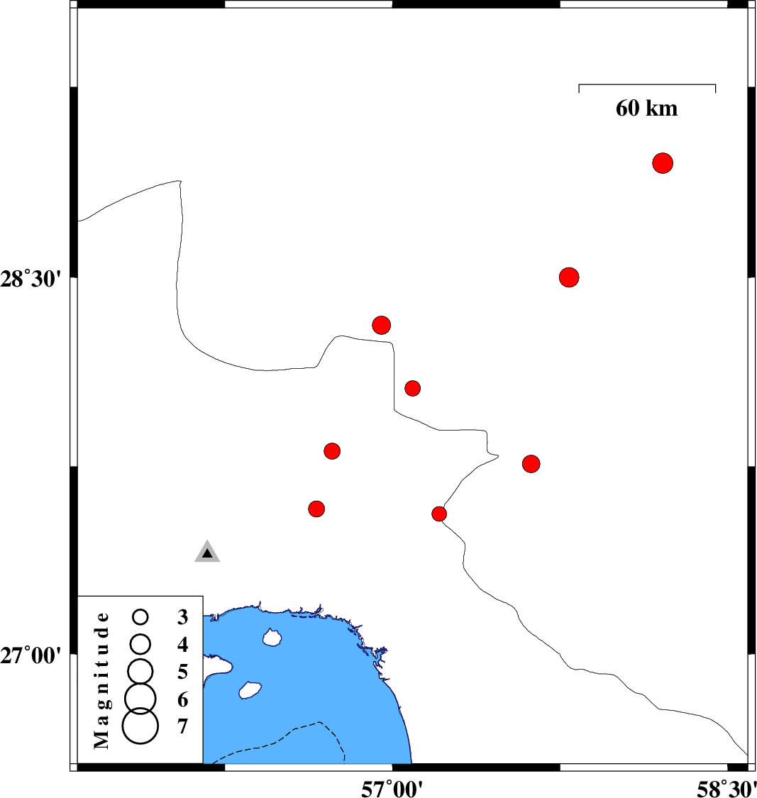 2014/06/18 | 00:29:39.8 | 04:59:39.8 | 28.95 | 58.21 | 16 | ML4.1 | Kerman Province, 22 km South-West of Bam | ||