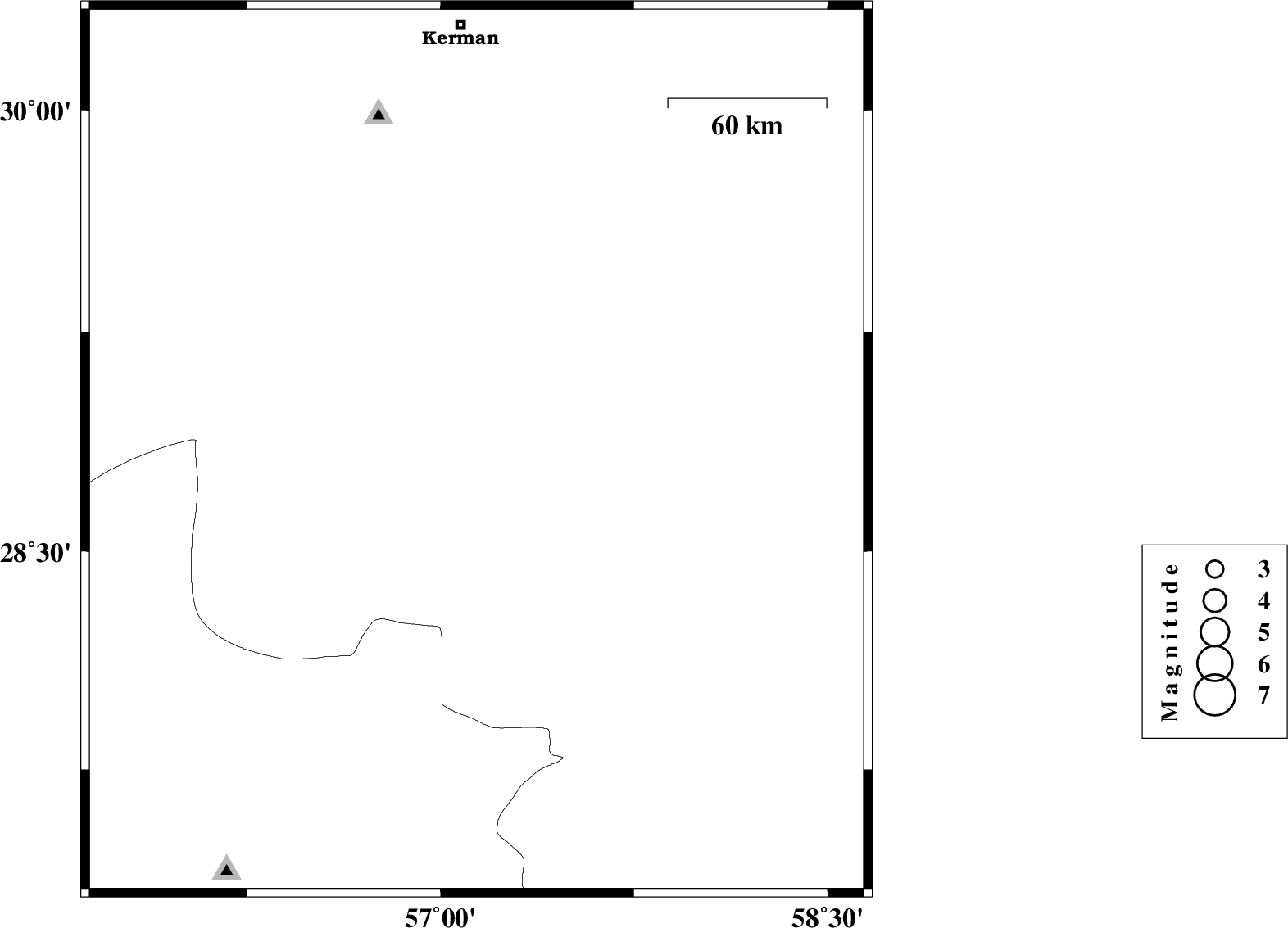 | 2014/06/25 | 14:20:11.1 | 18:50:11.1 | 27.76 | 57.62 | 14 | ML3.5 | Kerman Province, 22 km South of Kahnuj | ||
