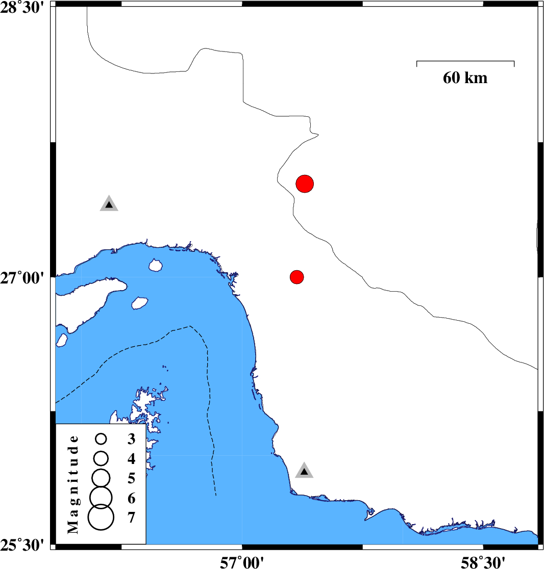 | 2014/07/22 | 15:22:42.8 | 19:52:42.8 | 27.52 | 57.39 | 25 | ML5 | Kerman Province, 16 km North-West of Manujan |