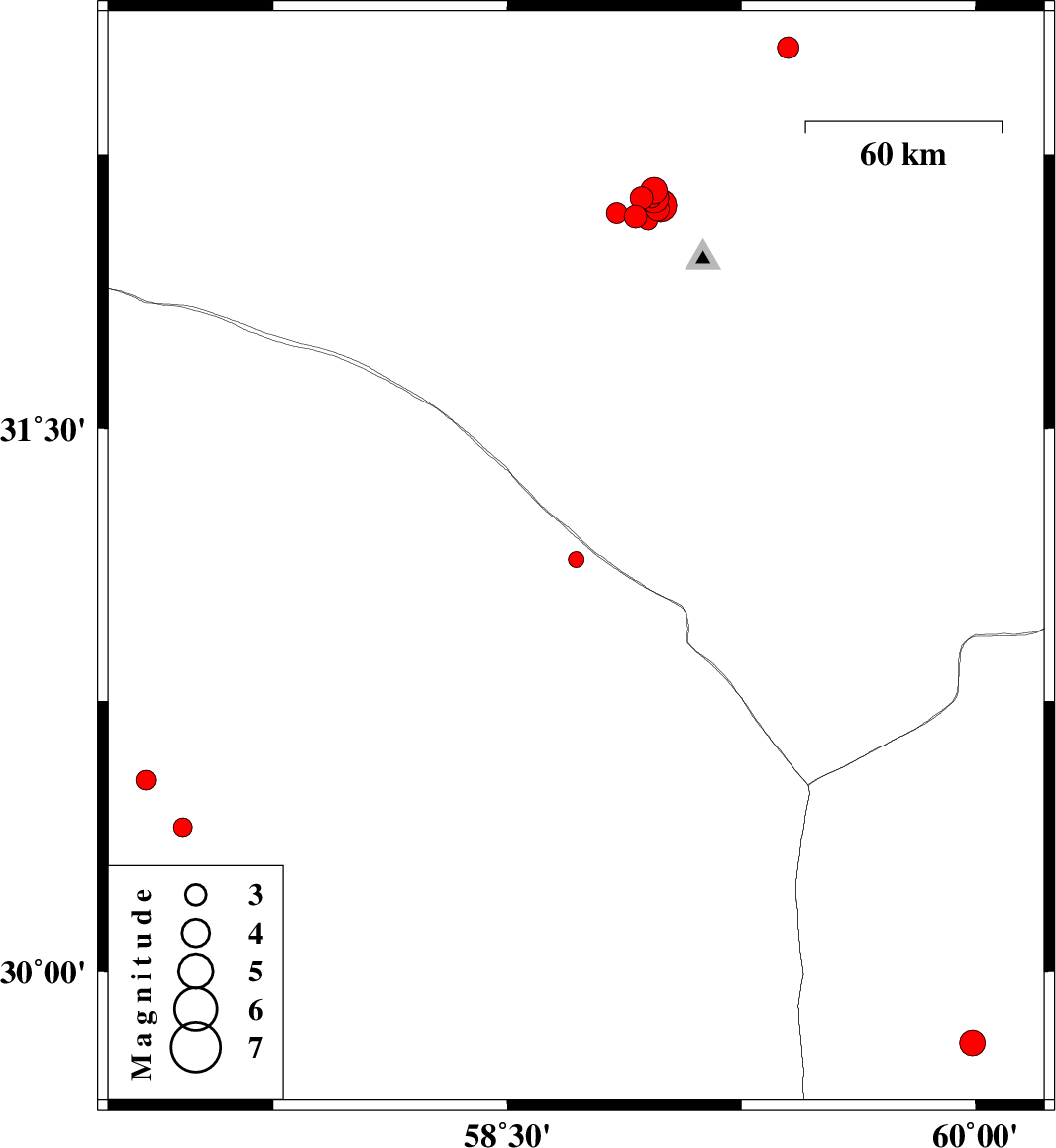 | 2014/07/26 | 21:34:16.3 | 02:04:16.3 | 31.14 | 58.72 | 15 | ML2.2 | Kerman Province, 133 km South-West of Nehbandan | ||
