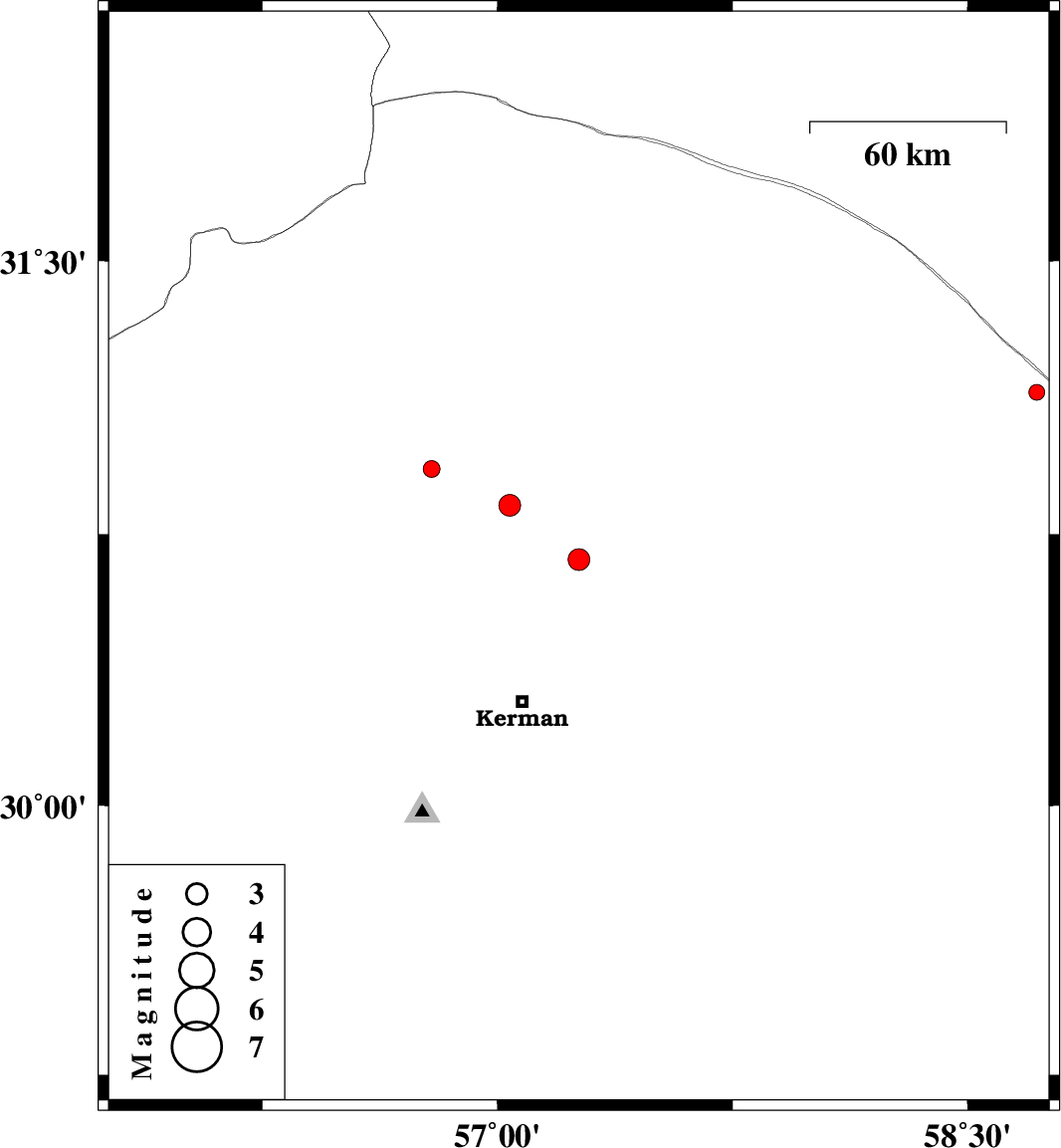 | 2014/07/27 | 00:04:14.9 | 04:34:14.9 | 30.83 | 57.04 | 14 | ML3.1 | Kerman Province, 45 km East of Zarand | ||