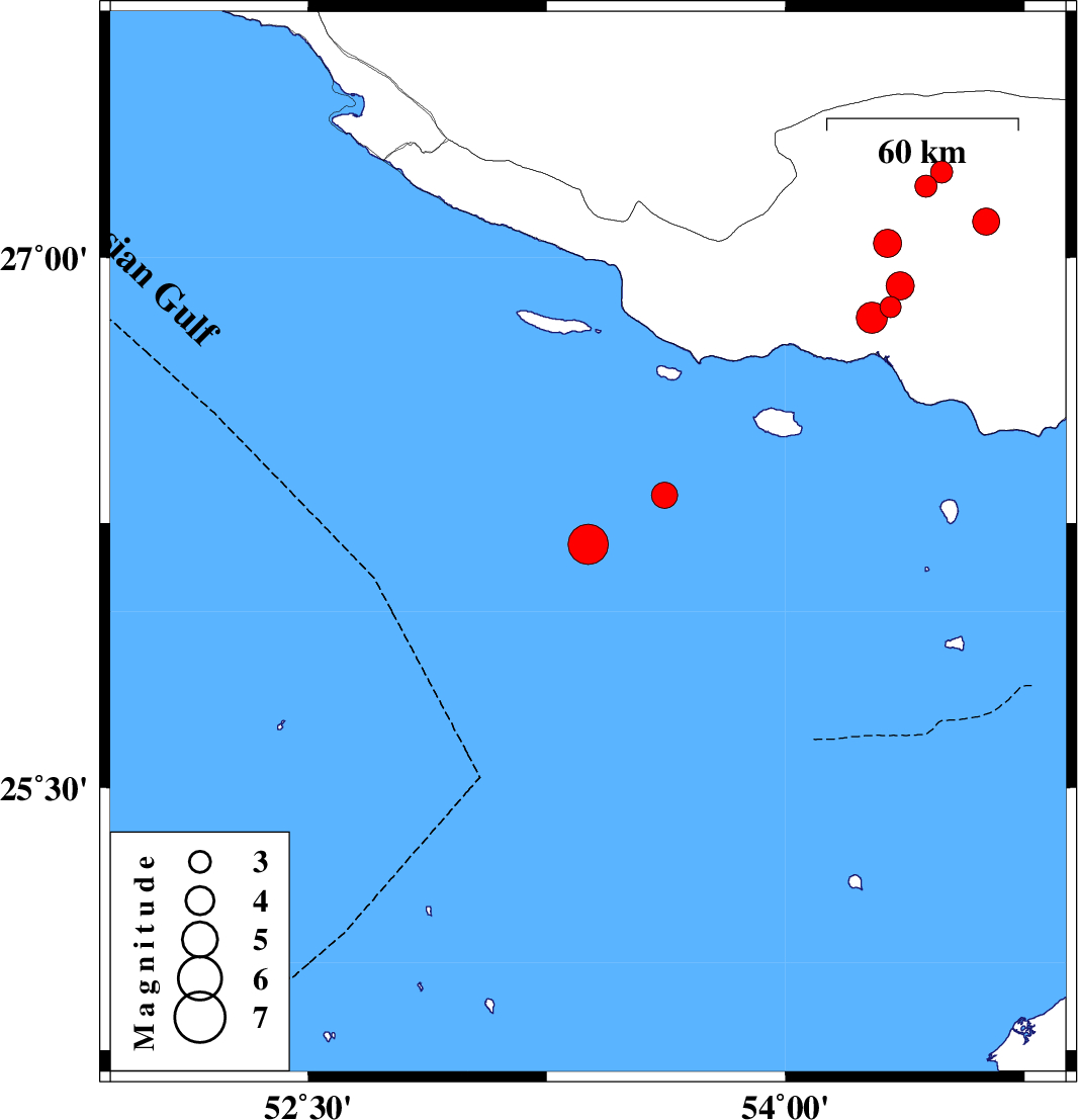 | 2014/07/30 | 01:32:06.9 | 06:02:06.9 | 26.19 | 53.38 | 15 | ML5.7 | Persian Gulf | ||