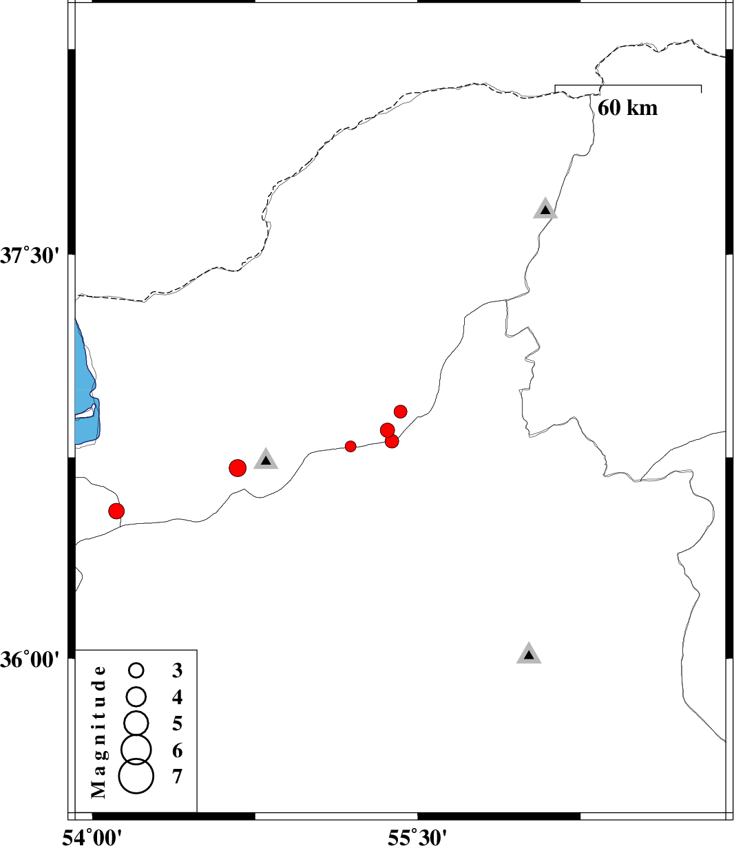 | 2014/07/04 | 16:11:50.6 | 20:41:50.6 | 36.79 | 55.19 | 18 | ML2.3 | Golestan Province, 25 km South of Ramian |