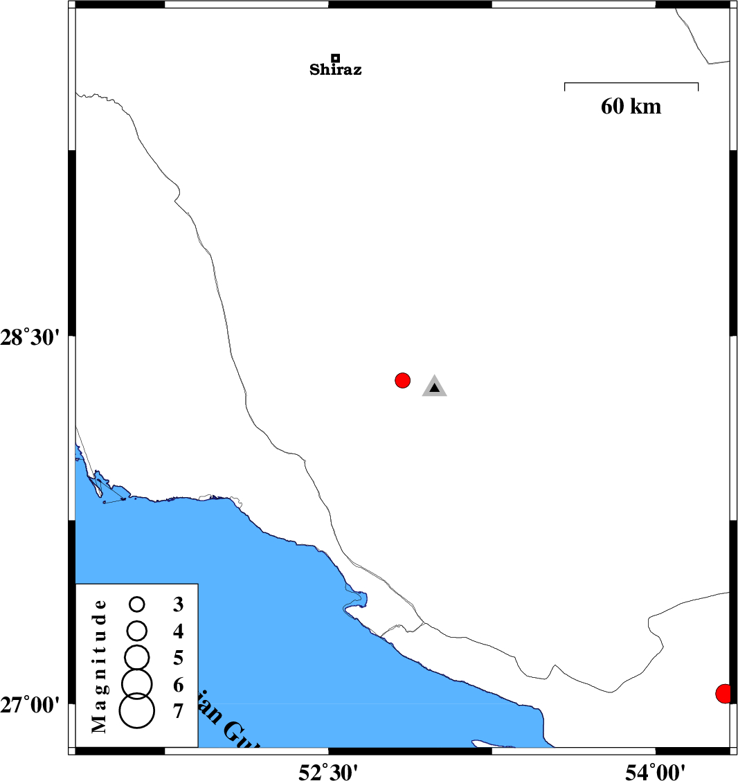 | 2014/07/29 | 15:32:08.3 | 20:02:08.3 | 27.04 | 54.32 | 46 | ML3.9 | Hormozgan Province, 18 km South of Bastak |