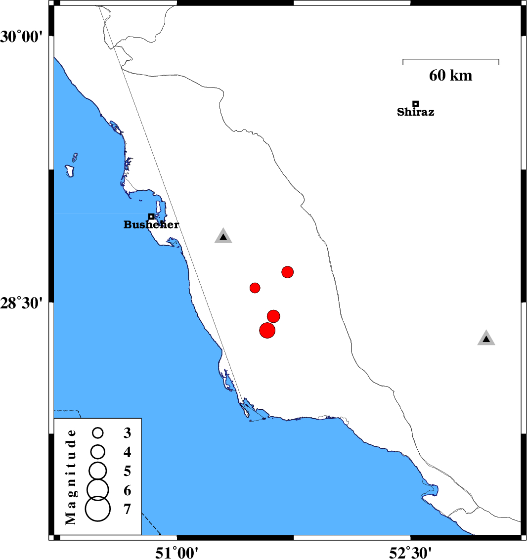| 2014/08/15 | 14:48:05.1 | 19:18:05.1 | 28.34 | 51.58 | 14 | ML4.5 | Bushehr Province, 40 km South-East of Khormog |
